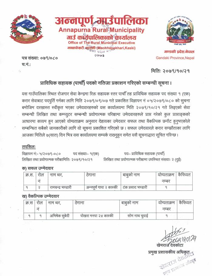 प्राविधिक सहायक (पाचौँ) पदको नतिजा प्रकाशन गरिएको सम्बन्धी सूचना ।