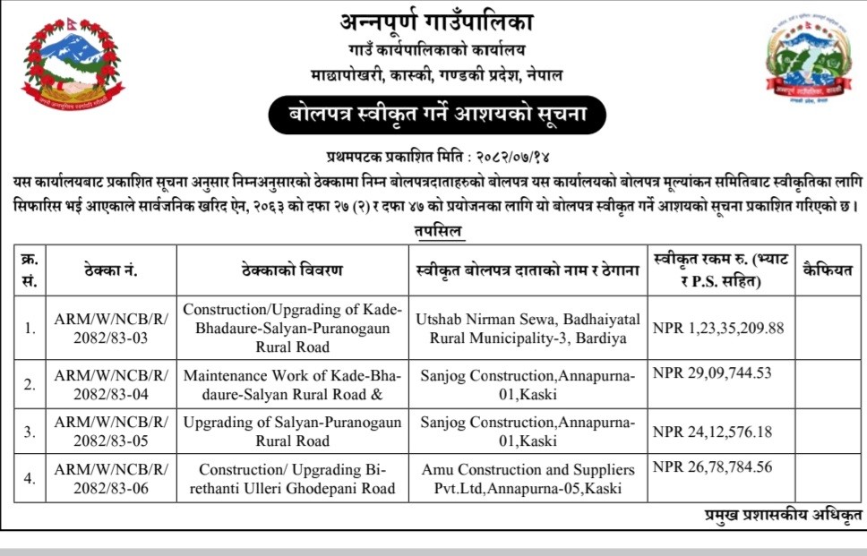 बोलपत्र स्वीकृत गर्ने आशयको सुचना