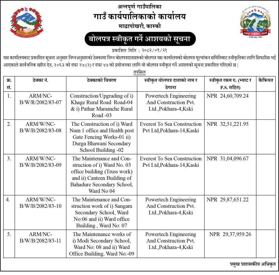 बोलपत्र स्वीकृत गर्ने आशयको सुचना