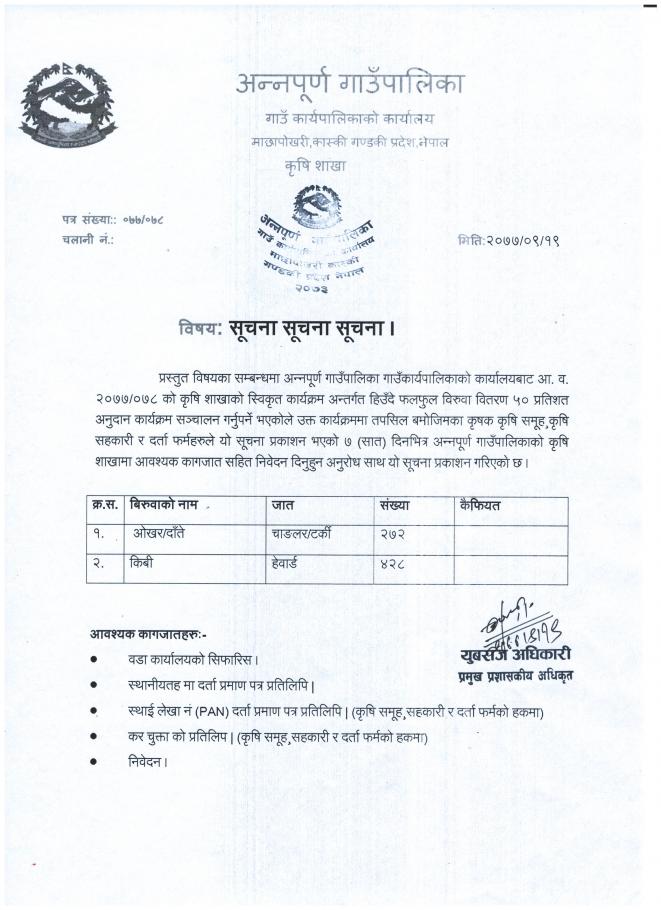 ५० प्रतिशत अनुदानमा हिउँदे फलफुल बिरुवा बितरणको लागि आबेदन पेश गर्ने सम्बन्धि सूचना!!!