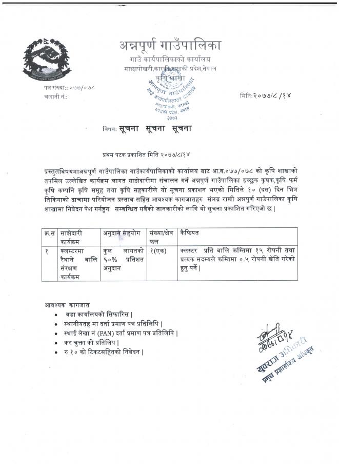 ९० प्रतिशत अनुदानमा क्लस्टरमा रैथाने बाली संरक्षण कार्यक्रमको लागि प्रस्ताब पेश गर्ने सम्बन्धी सूचना!!!