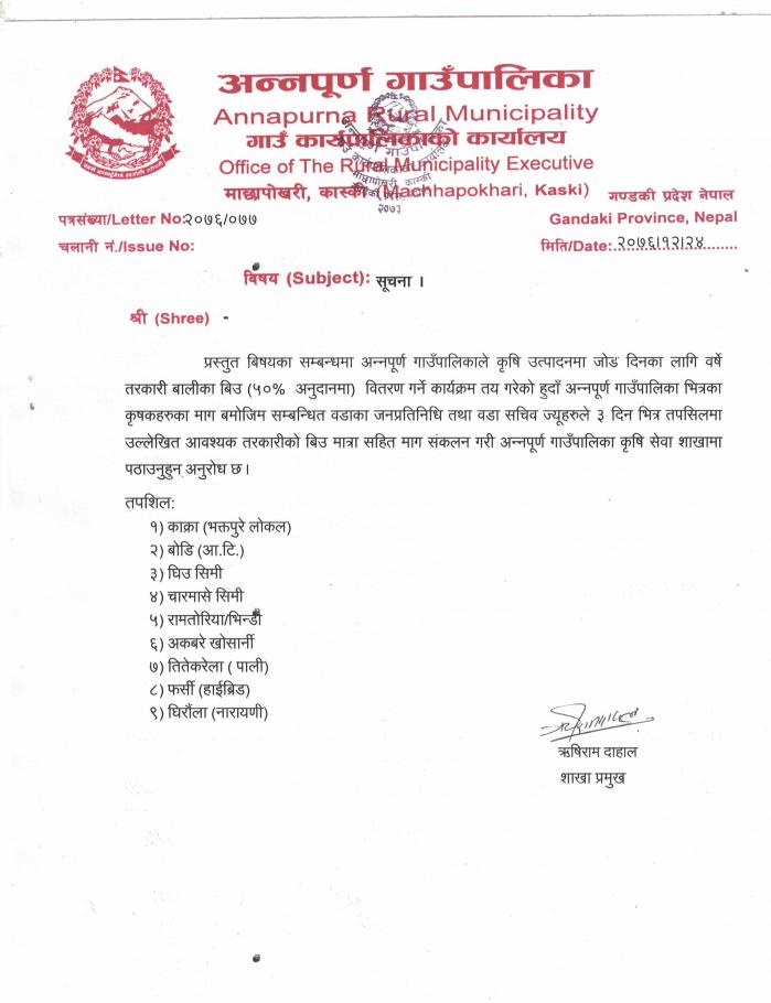 तरकारी बिउ माग सम्बन्धि सूचना